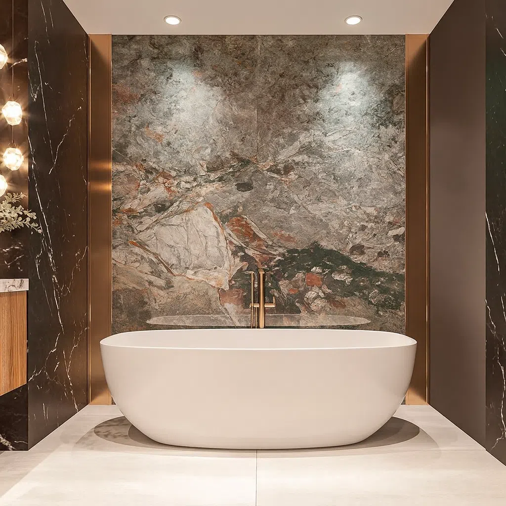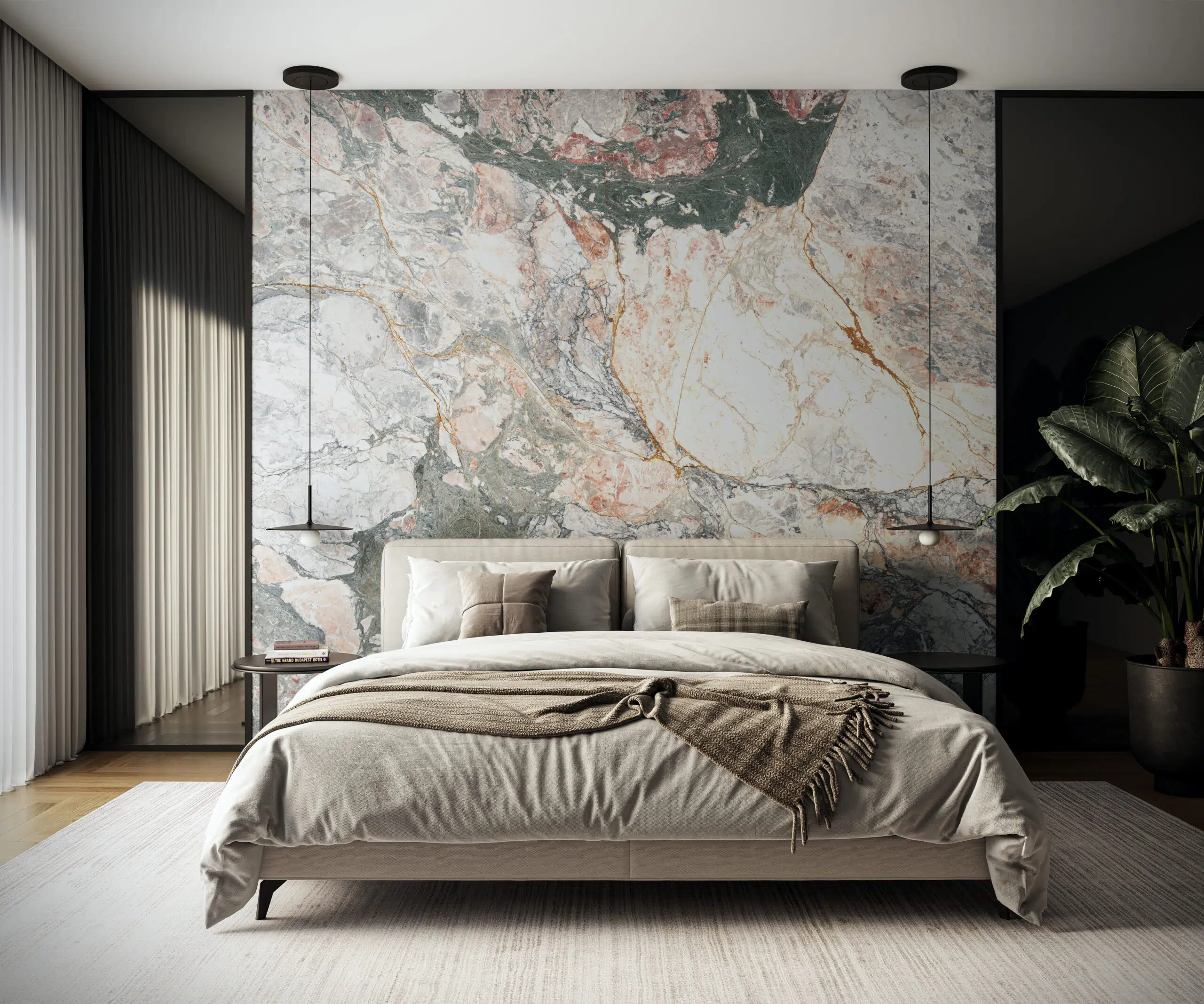Natroccia® Four Seasons Marble is an exquisite natural stone from Cambodia, admired for its harmonious interplay of colour and texture. The surface reveals a sophisticated palette of soft greys contrasted with forest green tones and subtle blush hues and warm copper details, creating a composition that evokes the ever-changing beauty of the seasons. The blend of colours brings both warmth and refinement, making it a versatile choice that elevates any interior or exterior space with timeless elegance.