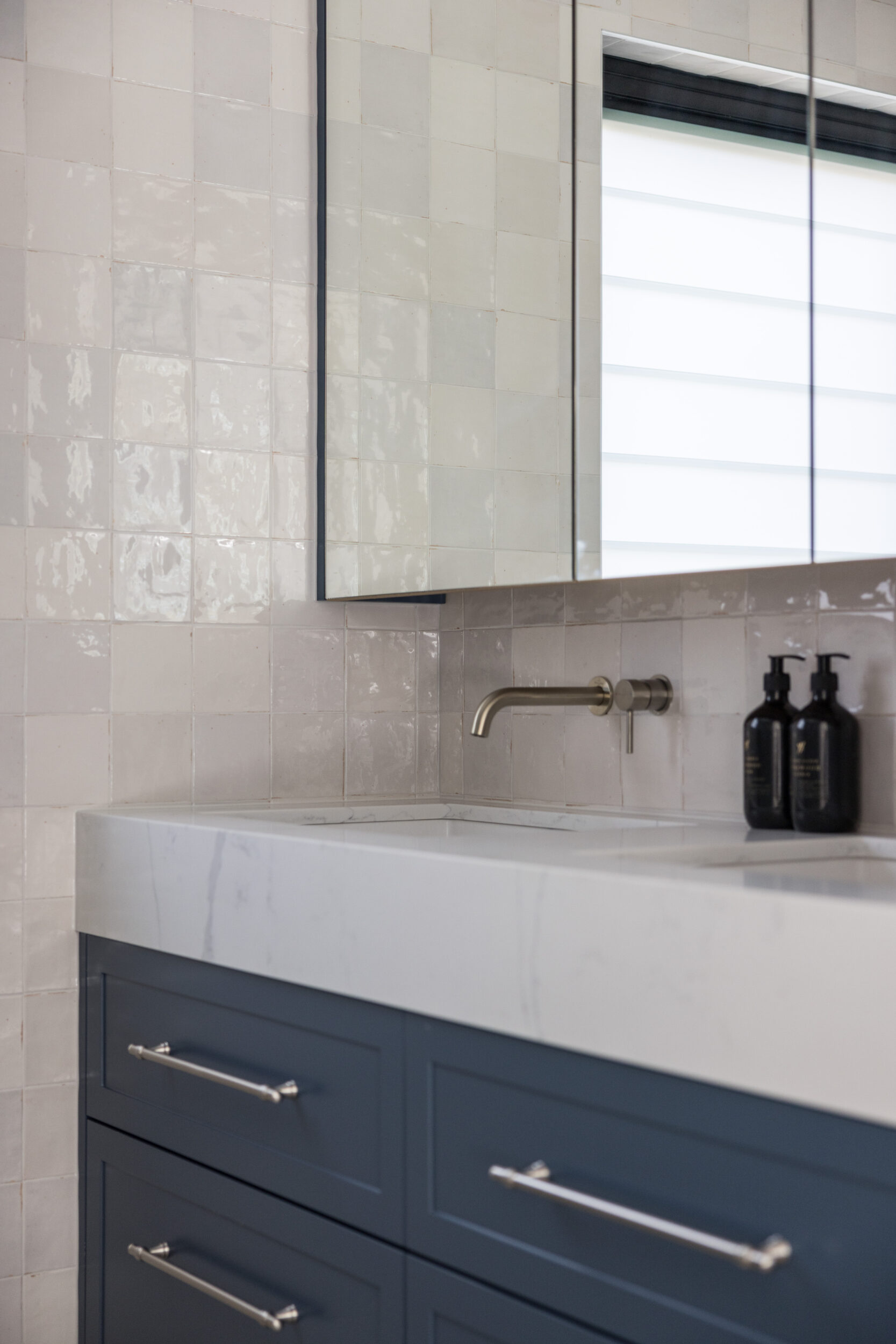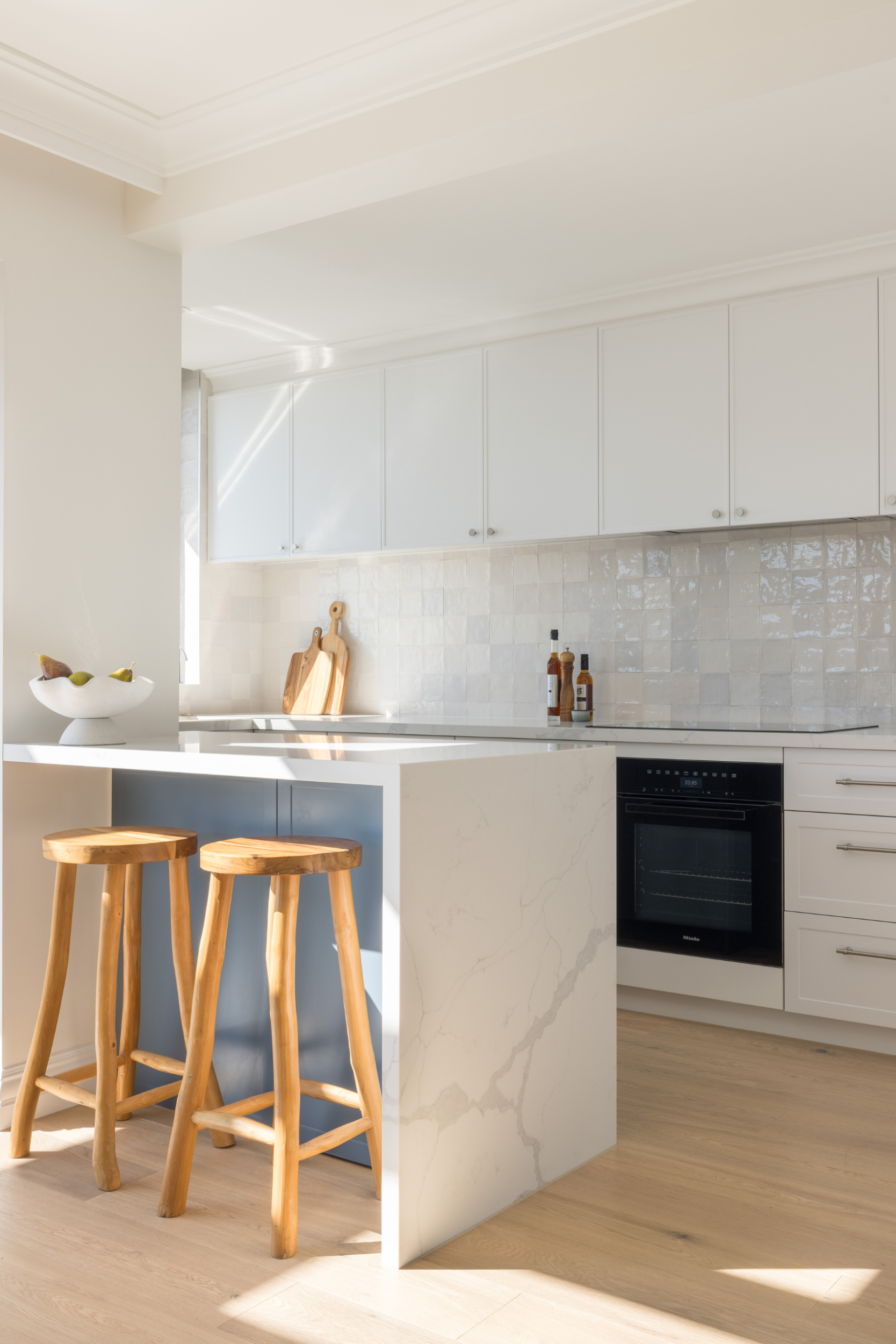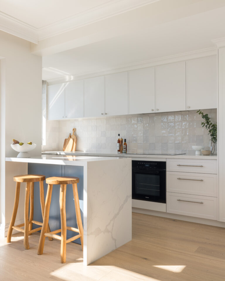 In the kitchen, the stone becomes a centrepiece, anchoring the shaker-style cabinetry and amplifying natural light. In the bathrooms and laundry, it introduces continuity and calm, reinforcing the coastal aesthetic through soft veining and a clean, airy finish.